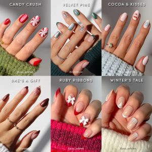 Ruby Ribbons – Our short almond nail set with a nude base. ruby-red French tips. and festive accents of 3D bows and pearl gems.