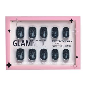 We’re seeing stars with the Cosmic Nail Set! This versatile and multidimensional design features an enchanting deep. moody semi-transparent black hue with silver sparkles throughout. To finish it off. we just launched a brand new. highly requested short squoval shape that instantly elevates your look without too much drama.