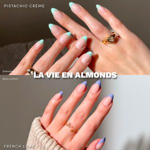 Introduce soft. creamy colors to your classic French tip with the La Vie en Almonds Bundle. Including 2 short almond French tips in pastel mint and lilac shades. this set delivers color to your fingertips without sacrificing elegance. Long-lasting. durable and très chic for spring. these press-on nails look pretty enough to eat.