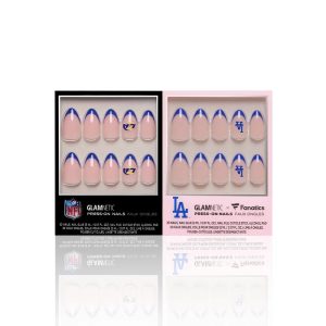 – Los Angeles Dodgers Press-On Nail Set: short almond French tips in Dodgers-blue with iconic accent nails sporting the team logo