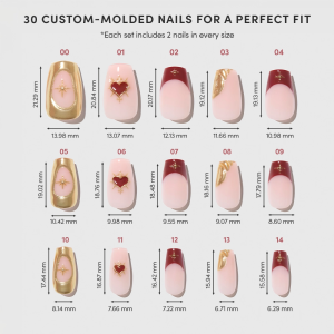 Rule every room with Queen of Hearts; a royal-worthy mix of romance and empowered love. These medium coffin nails feature a semi-transparent nude base adorned with rich burgundy and 3D gold heart and star designs throughout. Equal parts regal and daring. this mani is made for the ones who lead with love.