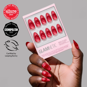 For the girl whose love language is bold and fierce (but still sweet!). Sent With Love is your must have. ‘sacred-fire-within’ set. This short almond design features a red velvet base with magnetic cat-eye heart accents that mesmerize and shine wherever love takes you.