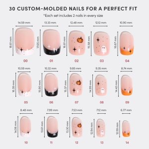 A sweet act with a sinister edge. The Tiny Pumpkin Nail Set takes the mainstage with alternating black. orange. and white French tips — dressed up with ghost and pumpkin accents. and a dash of sparkle for good measure.