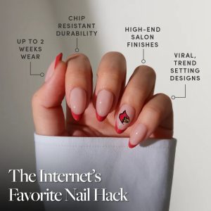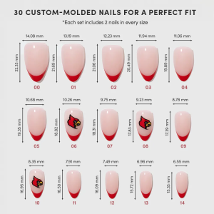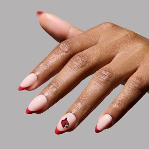 Rep your school colors in every way possible. The Louisville Cardinals Press-On Nail Set pays homage to the Cardinals with red French tips and accent nails flaunting the iconic team logo. Designed in a short almond shape with a sleek. glossy finish. these salon-quality nails are easy to apply in 10 minutes — right before tailgates or even during game-day commercial breaks. Go Cards!