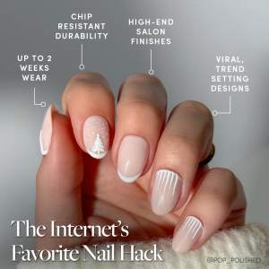 Every nail tells a story with Winter’s Tale. This short oval set pairs a glossy nude base with classic white French tips and raised matte detailing of snow and Christmas trees. The mix of shine and texture creates a frosted finish that feels polished. festive. and full of wintry charm.
